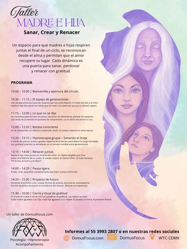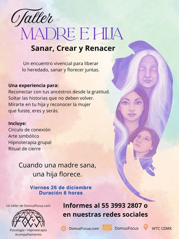 El objetivo de este taller es reconocer los patrones emocionales heredados, liberarlos para no trasladarlos y fortalecer la comunicación y vínculo afectivo madre-hija. Integrando enfoques de psicopedagogía, biodescodificación, hipnoterapia y expresión artística, se propone un espacio vivencial y formativo que promueva la sanación transgeneracional y el crecimiento conjunto.